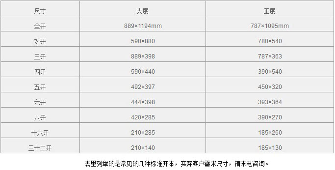 2、國(guó)際標(biāo)準(zhǔn) A4=210×297㎜ 1P=16開=A4.紙張的克重(紙張的克重是指每平方米紙張的重量,如70g是指每平方米紙的克重是70克;克重越高, 紙張?jiān)胶瘢? 常用的印刷紙張克重通常有以下幾種: 1、雙膠紙:60g 、70g、80g、100g、120g、140g不等 2、古版紙:52g 3、打字紙:28g、42g 4、銅版紙:60g輕涂、80g、100g、128g、157g、200g、250g、300g 、350g等 5、包裝用紙:一般分灰底白、白底白、銅版白卡等幾種,規(guī)格、品牌不同克重不一。 6、特種紙:一般用于包裝、書幀裝潢、文件資料的封皮及墊襯用,規(guī)格不同,克重不同,價(jià)格也不一樣,具體請(qǐng)按實(shí)際樣本。